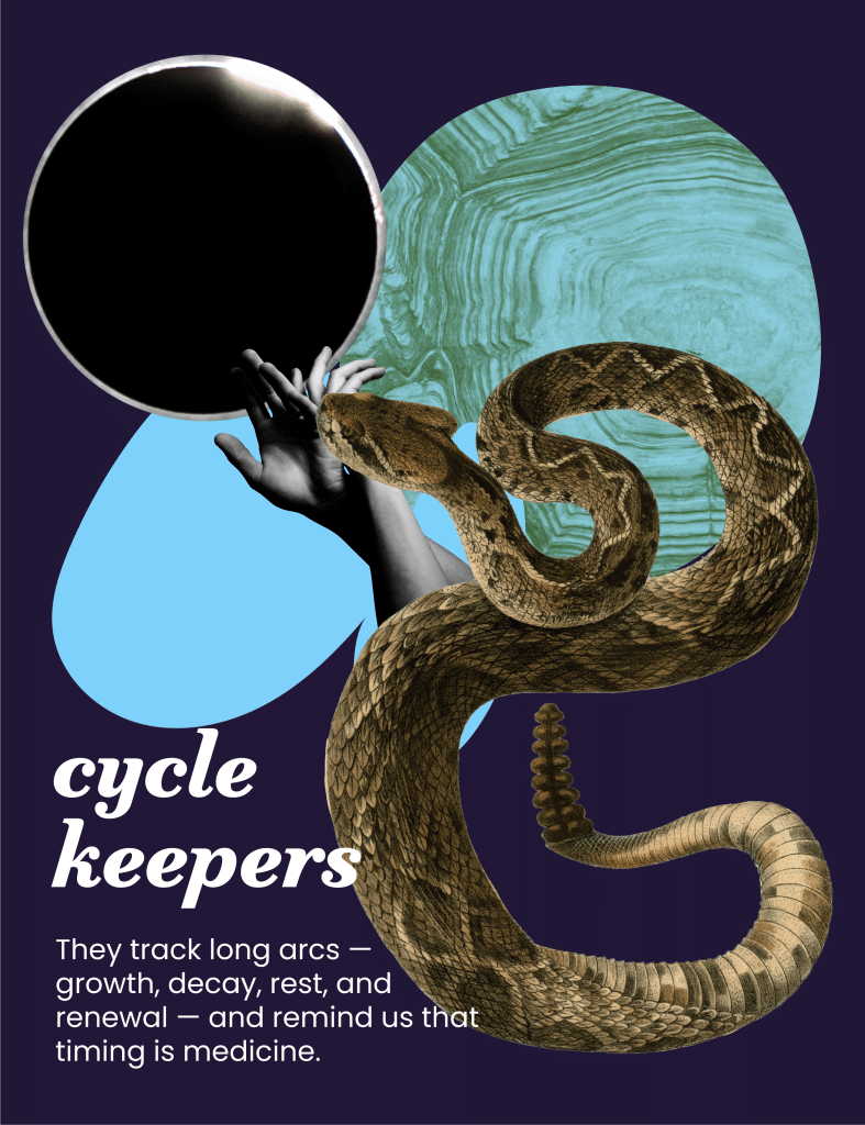 With one eye on the past and another on the future, Cycle Keepers carry wisdom across time. They ask: “Who are we accountable to beyond our own time?”—reminding us to act with future generations in mind.