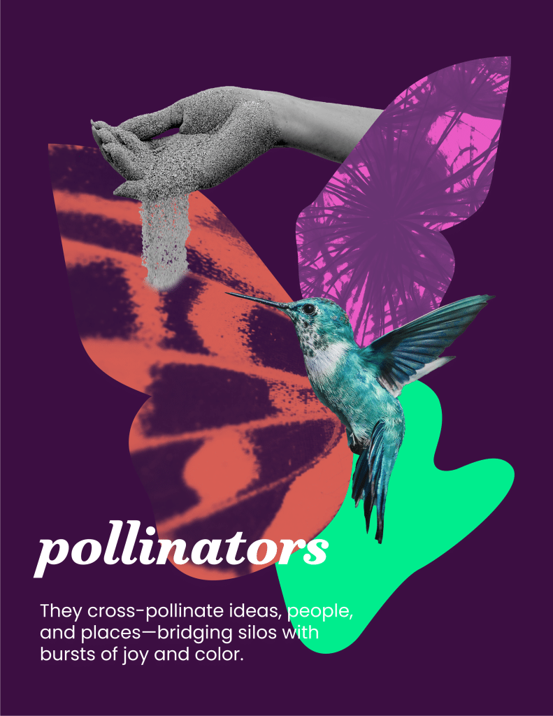 Moving across spaces with ease, Pollinators weave relationships and nurture community care. They ask: “How can we create the communities that will connect us?”—reminding us that transformation is never solitary.