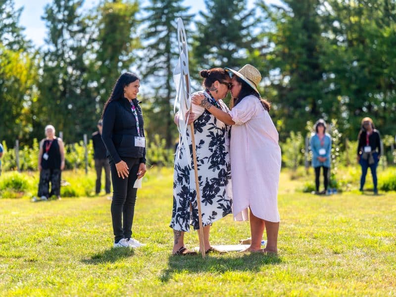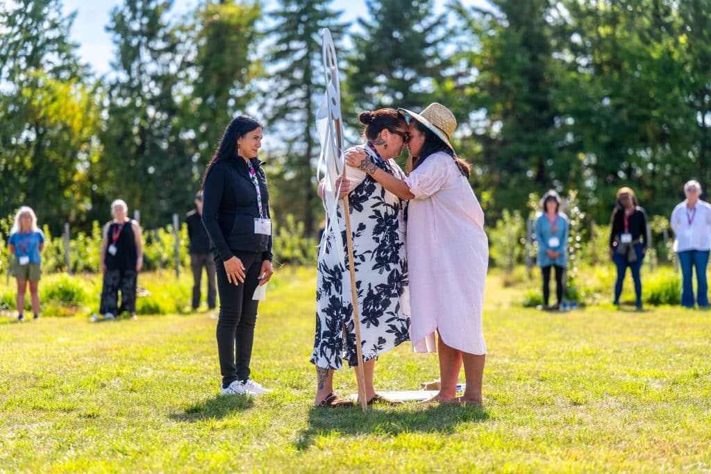 The land itself was answering—trees amplifying and releasing the call, the whole orchard participating as witness. For the sister walking with Stacey, the ceremony opened a profound reconnection that could only be expressed through the hongi—the pressing of noses, the act of connection and exchange of breath with Awhina and Stacey.