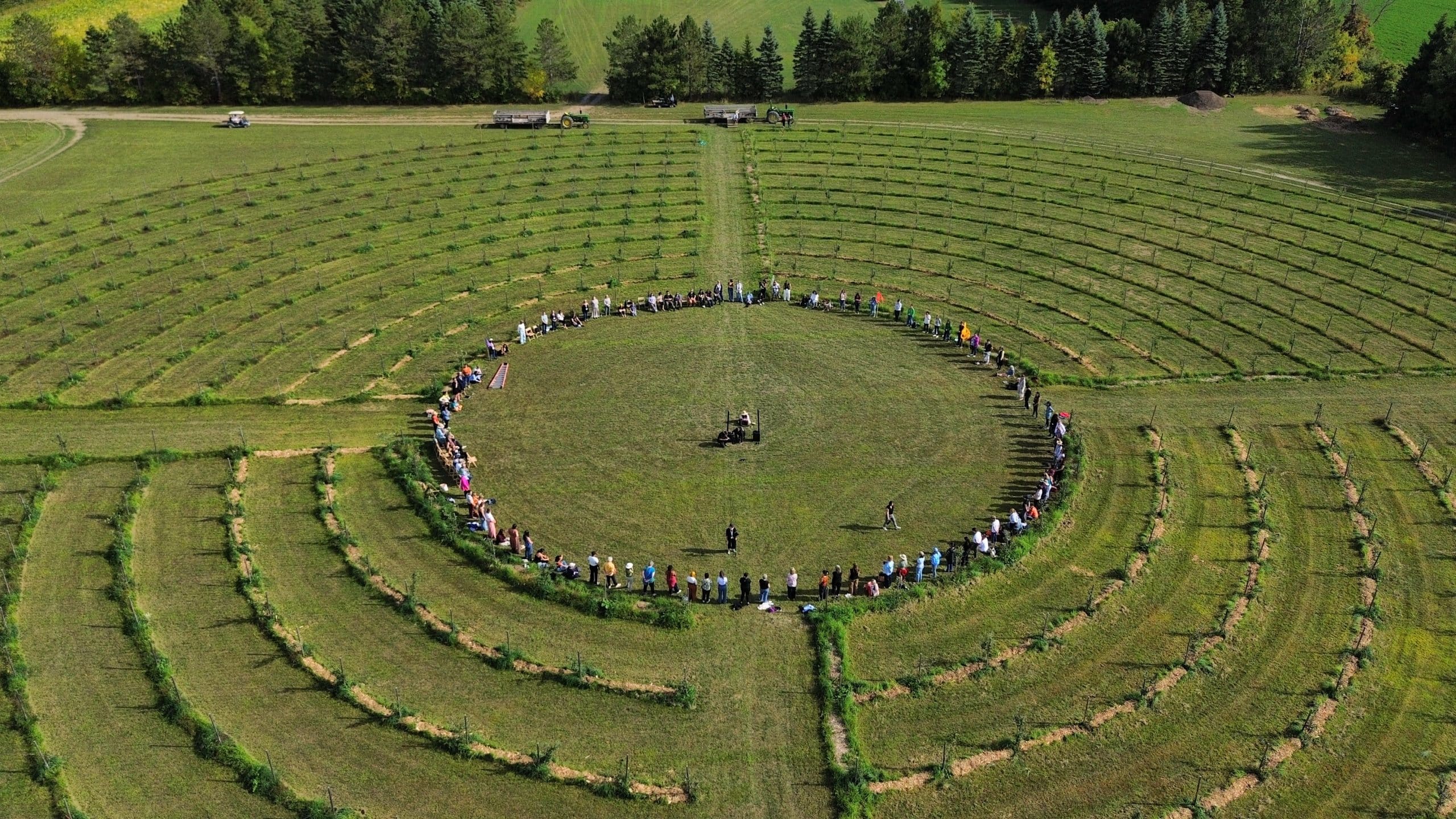 Late into the second afternoon, we were drawn, almost summoned, to the spiral apple orchard for our closing ceremony. Walking toward it, it felt less like choosing a place and more like being chosen by it. Its sacred geometry invited us to step out of linear time into ceremonial time.